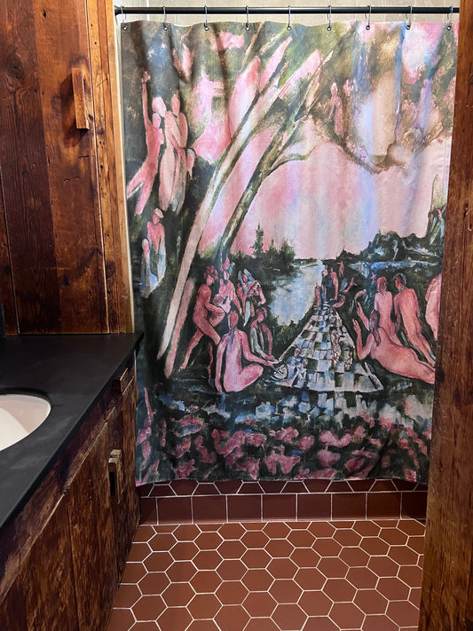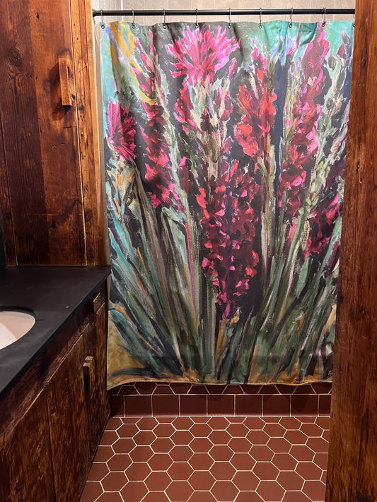 Polyvinyl Art Shower Curtain - Purple Hollyhock & Red Dahlia Garden